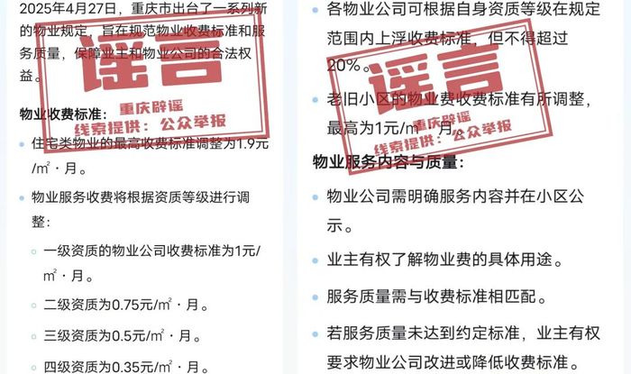 经向市发展改革委核实,重庆市近期并未出台相关物业规定。目前,谣言线索已转交公安机关进一步调查处置。